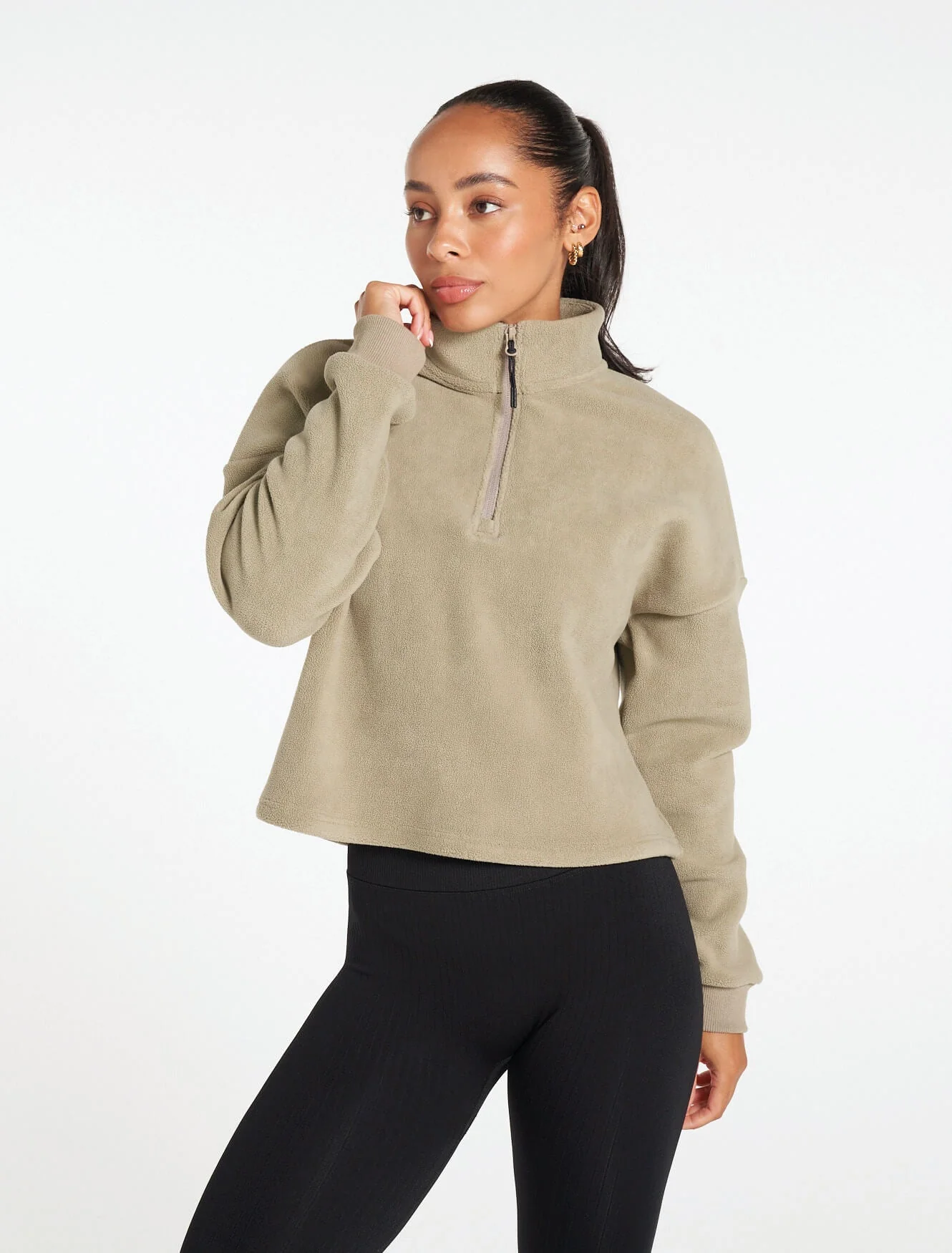 Once you've felt it, you'll never want to take it off. Carefully constructed with an incredibly soft teddy borg fleece to keep you warm, featuring an oversized boxy cropped fit, high neck with 1/4 zip opening, dropped shoulder and long sleeves.